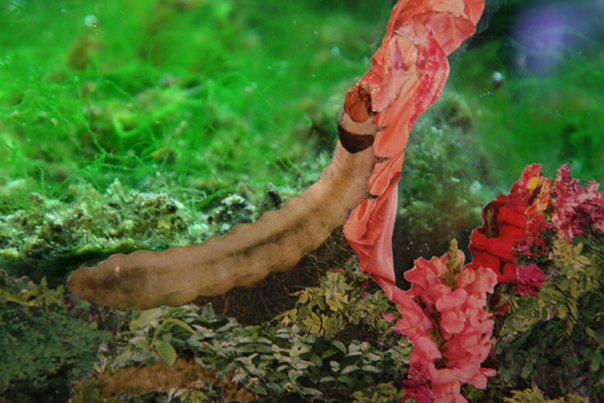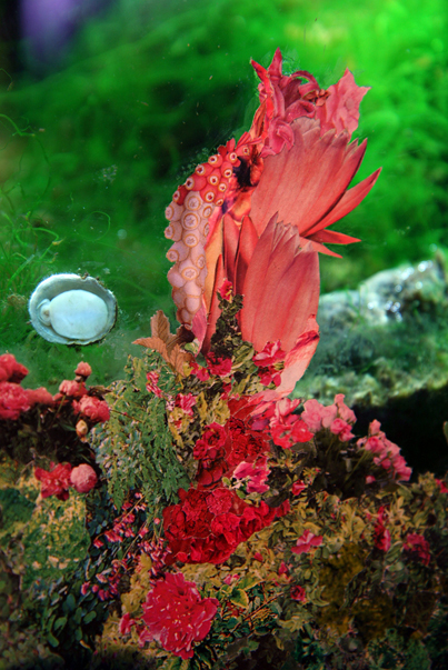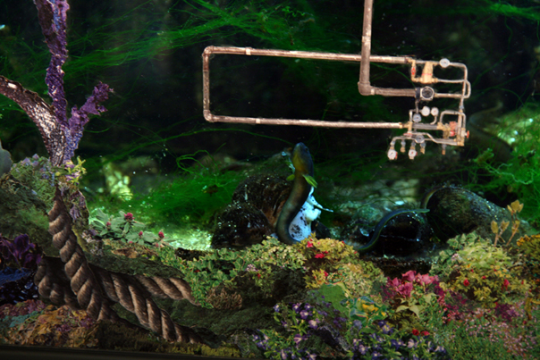 Collage on plexiglass on the front of a fishtank.